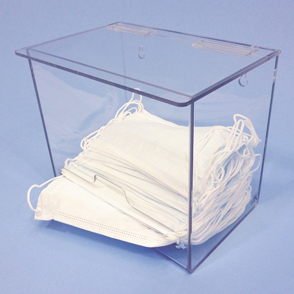 Base opening allows for one at a time retrieval. Hinged lid allows for easy access. Wall mount or free standing. Made of 3/16″ PETG. 9″Wx8″Hx5-1/4″D