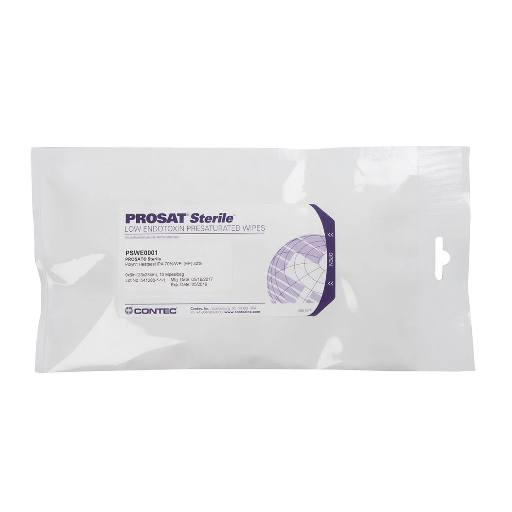 PROSAT® Sterile™ Low Endotoxin Wipes are made from 100% knitted polyester Polynit Heatseal wipes presaturated with a blend of 70% IPA (Isopropyl Alcohol) and the highest grade distilled Water for Injection (WFI). Each batch of sterile IPA wipes has a guaranteed endotoxin level of less than <0.25EU/mL per device. The sealed edge wipe produces a very low level of particles and fibers and is ideal for use in product contact areas. Each pouch contains a small number of Isopropyl wipes eliminating any waste at the end of a session. Double bagged and validated sterile, these Low Endotoxin wipes are suitable for use in the most critical pharmaceutical cleanrooms. Made in the USA in Contec's ISO 90001:2015 registered facility. Complete sterility validation reports available upon request.