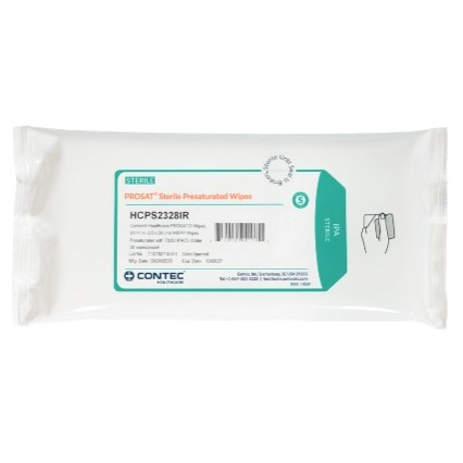 PROSAT® Sterile™ Wipes are specifically designed for cleaning all critical surfaces found in the pharmacy cleanroom. Sterilized by gamma irradiation and validated sterile to a 10-6 Sterility Assurance Level, these wipes are compatible with Class 5 environments and saturated with an optimal amount of isopropyl alcohol for cleaning. The meltblown microfiber polypropylene fabric offers a unique metered release of IPA which removes contaminants and leaves a consistent level of solvent on the surface after wiping is completed. The guesswork and inconsistency involved in a spray and wipe process is removed from the procedure, making it possible to create a cleaning protocol that is consistent, repeatable, effective, and easier to implement, document, and validate. Additionally, PROSAT® Sterile wipes enhance operational benefits and reduce inventory SKU’s and storage space. Assured sterility of both wipe and 70/30 IPA/DI Water eliminates the risk of introducing spores and other contaminants to the process either through contaminated solvent or use of inappropriate wiping materials such as cotton gauze.