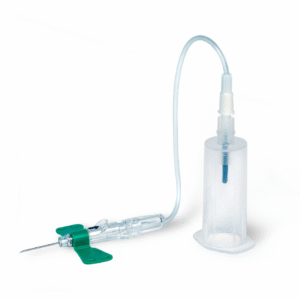 With ease, safety and comfort in mind, this device features an exclusive version of the “Butterfly Needle”, designed with a sliding button that using pull force, activates in-vein needle retraction after use.